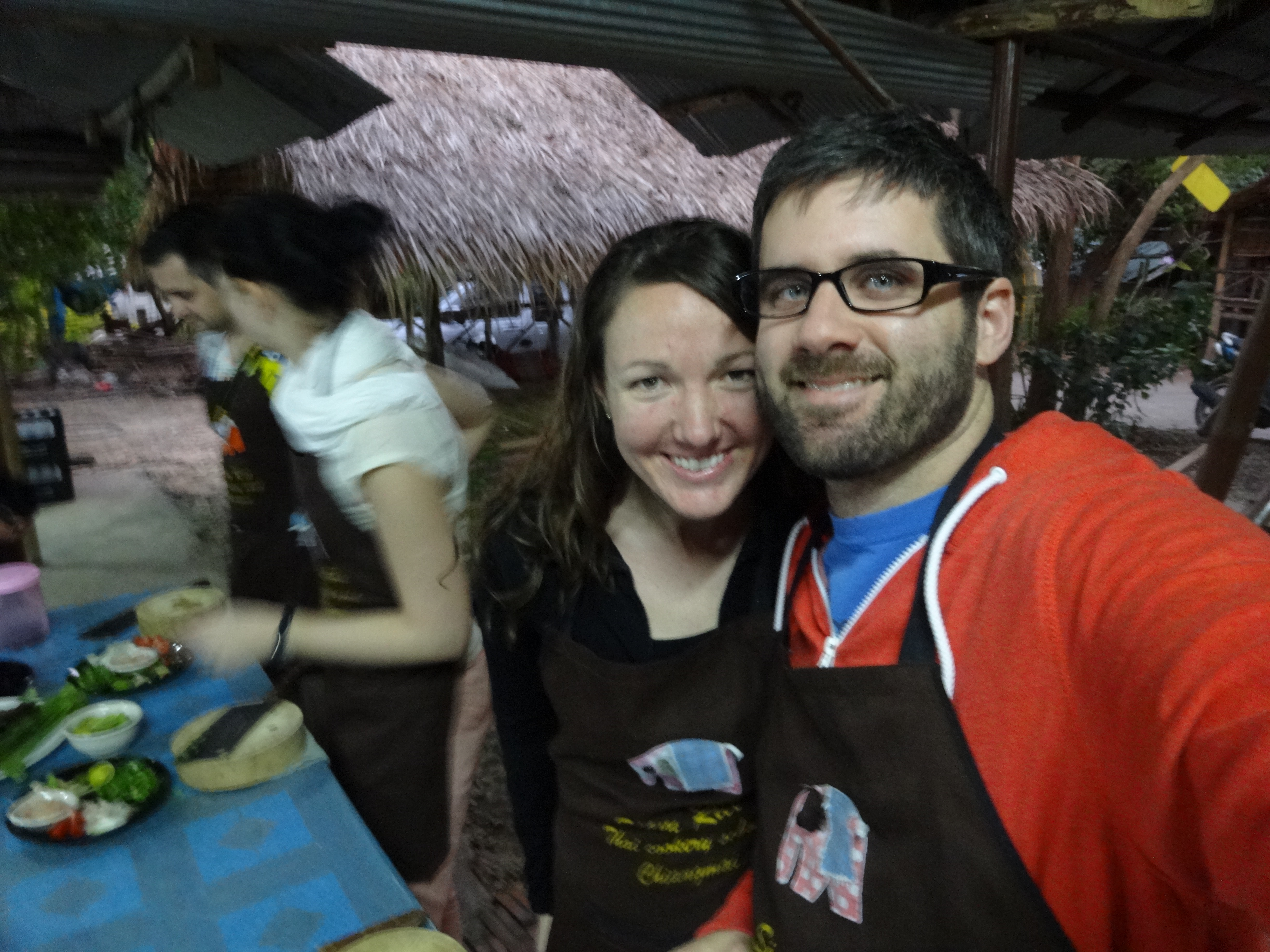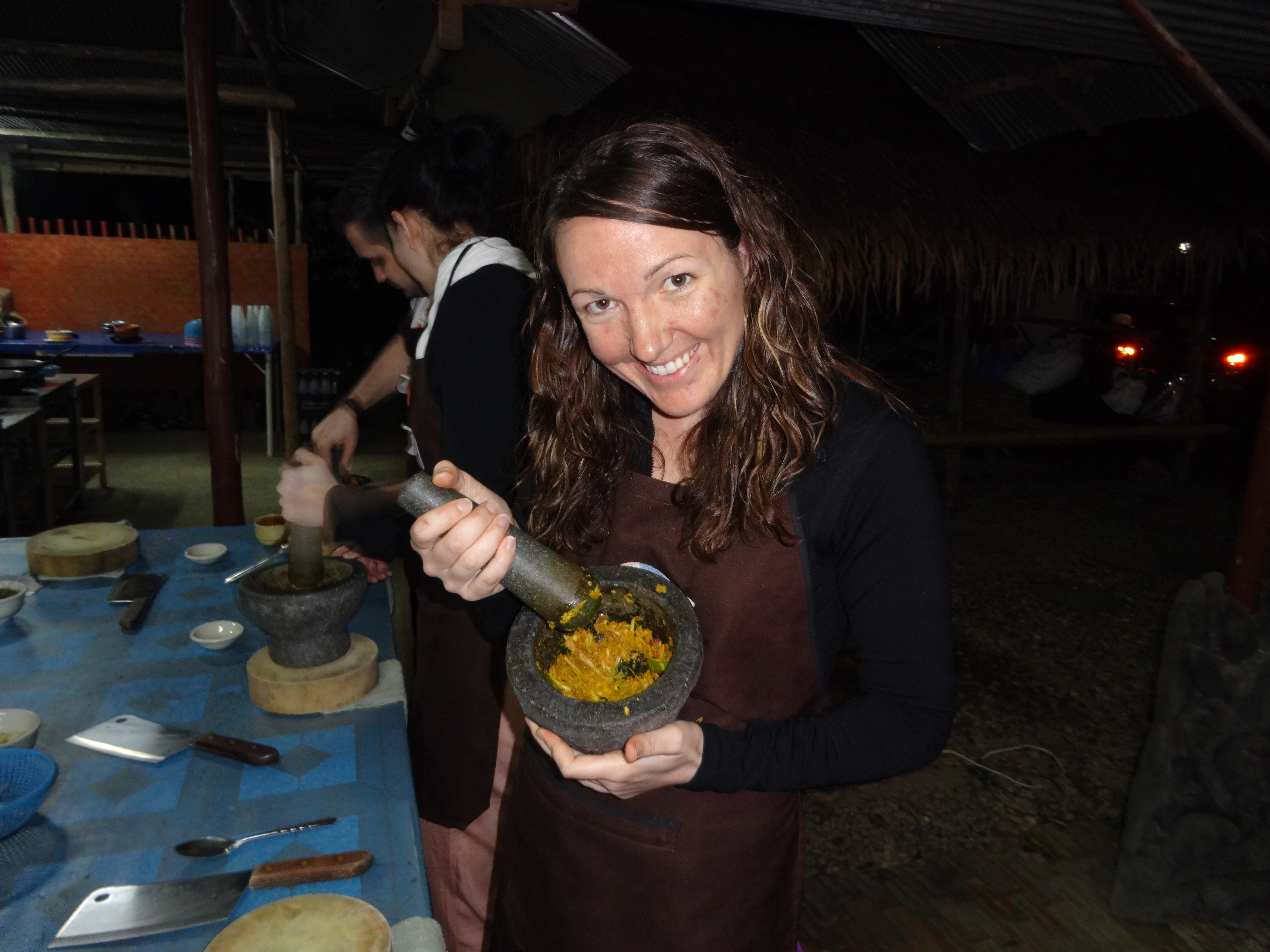 Next we got right back into things and prepared the ingredients to make our curry and our stir fried vegetables. I decided to make yellow curry (since I am a wuss and can’t handle spicy foods) and Trent decided to make jungle curry (a very spicy curry). We put our first ingredients into the mortar and began crushing them with the pestle. Once we had a paste, we had the base for our curry. Then we started cooking, added the chicken and combined all of the other ingredients and had the beginnings of round number two. We covered our curry to keep it warm and began making our dessert. For me, it was no question, I wanted my favorite Thai treat- Sticky rice with mango! We didn’t have to actually make the sticky rice as we were told it is a long process and can take a full day to make. But we did make the delicious sauce. Once it was finished, we sat down to rice, curry with vegetables, and dessert. I don’t think I’ve eaten that much food before or since! We packed it in until all 5 dishes had been annihilated. Then we thanked our teacher, Pot, received our class certificates of completion and a cookbooks to bring home to (hopefully) be able to replicate some of the recipes. Thai food is so flavorful and the cooking class opened our eyes to see all the hard work that goes in to preparing our favorite dishes. We really enjoyed our evening at Siam Rice Thai Cookery School!