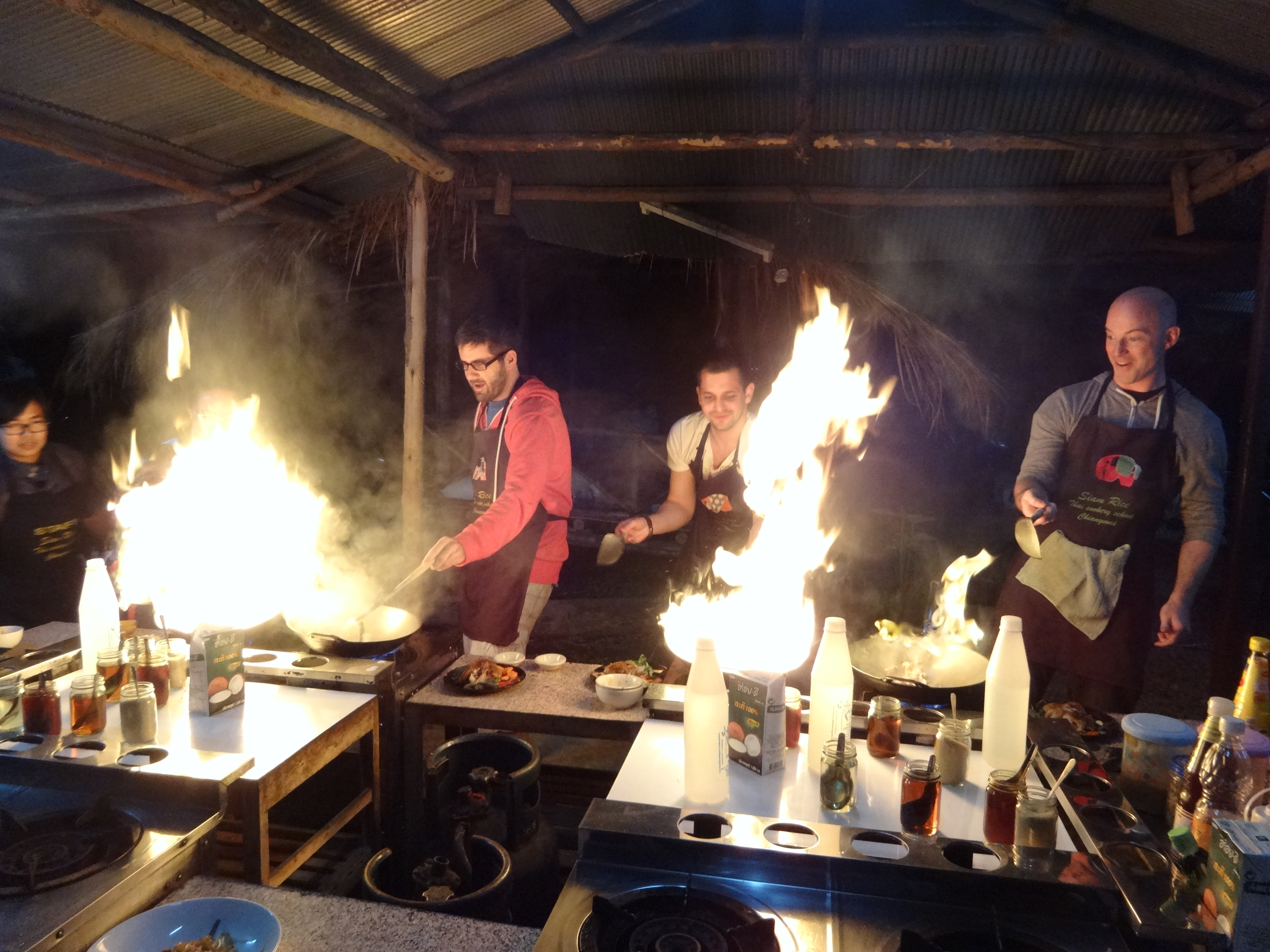 We began with the soup. I chose chicken coconut soup and Trent made hot and creamy soup. We both learned how to correctly slice up our ingredients and how to mix them together to create the jam-packed flavors of Thai food. When we finished cooking our soup, we began to cook our noodles. I chose Pad Thai- one, because I love it, and two, because it was the only non-spicy option. Trent chose to make drunken noodles. Pad Thai was kind of stressful to make because it is made in a very short time and the timing of each ingredient is very important. I quickly obeyed each order our instructor gave and within two minutes, I had Pad Thai ready and waiting to be eaten. Trent’s dish was not as fast, but definitely just as stressful. He got to play with fire! (It shouldn’t surprise you to find that ALL the men in our group decided to make this dish) His dish required a HUGE flame so I was glad that I got to watch from a safe distance and record him working his magic. When they finished, we all sat down to our first round of food: soup and noodles. This would have been plenty to fill me up but we were just getting started!