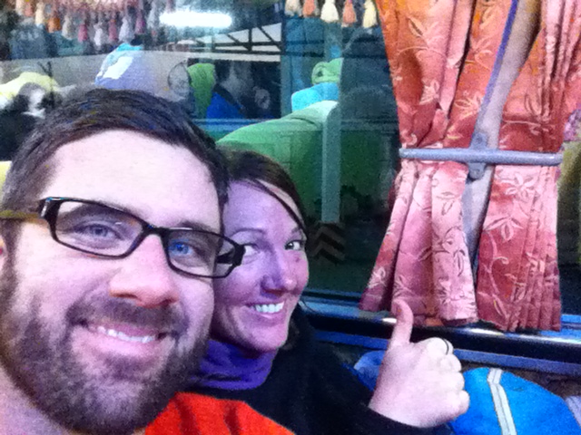 So… to set the scene… here we are after just having been in the wilderness for three days, we haven’t showered at all and we are pretty exhausted. I was already feeling sorry for anyone who would have to sit near us, although we tried as best we could to sponge bathe ourselves in the bathroom before we left. Our tuk-tuk comes to pick us up and we get half-way to the bus station before he realized that he had forgotten to pick someone else up, so we made a U-turn, went back, and then headed to the station. When we arrived, I could already tell that something was wrong… there were our two friends, clearly exasperated, still standing there (they were supposed to have left an hour ago). Apparently their bus didn’t leave until 5:30 like ours, and they hadn’t yet been issued their tickets although they’d already paid for them. Their driver was being rude and making fun of them to others who were waiting and they had clearly had enough. So when we got there, our first task was to deescalate the situation. Luckily not long thereafter their driver came with their tickets in hand. We waited a short while before we were allowed to embark. Both of us fought hard for front seats, as we had been told that the motion sickness wouldn’t be so bad there. We succeeded and commandeered the first two rows of seats. The bus continued to fill up until we had already gone beyond capacity- there were people that spent the entire 13 hours sitting on the bus floor.