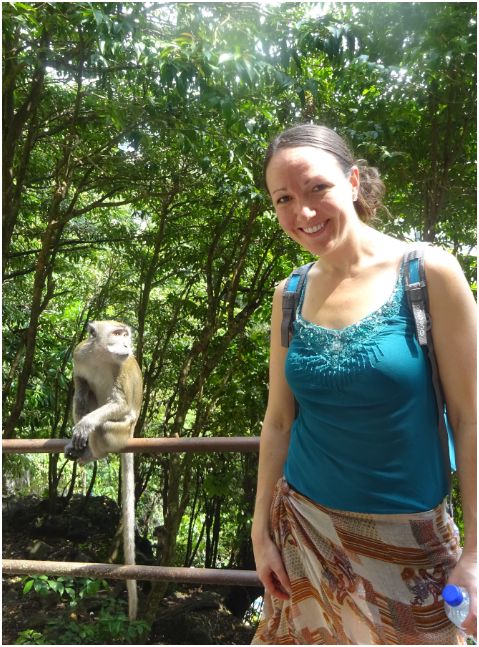 After we had finished milling about, we headed back outside. But I wasn’t finished watching the monkeys! We wandered over to the Dark Caves and sat on the stairs watching these silly monkeys frolic about. When we’d finally had our fill, we walked back down the stairs, turned in the sarong, and headed out.