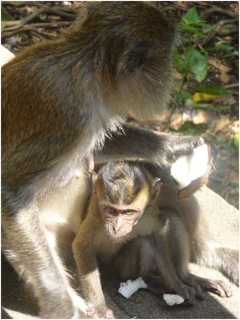 Then we embarked on our steep climb up 272 stairs to reach the entrance to the caves. Along the way we saw a monkey, then another, then all of a sudden there were monkeys everywhere! This, to me, was not frightening so much as entertaining. I LOVE monkeys. I think they are so funny (and cute)! These particular ones were aggressive if you had food, but since we just had our water bottles carefully tucked away in our backpack, we seemed okay. Some people were feeding the monkeys, many were simply content just to sit back and eat some discarded or stolen food item, and others were carrying around small baby monkeys wrapped around their stomachs. We must have spent 20 minutes on the stairs, simply watching and enjoying the monkeys. We watched as one clever monkey sank his teeth into a water bottle and let the water drain out while he lapped up the puddle.