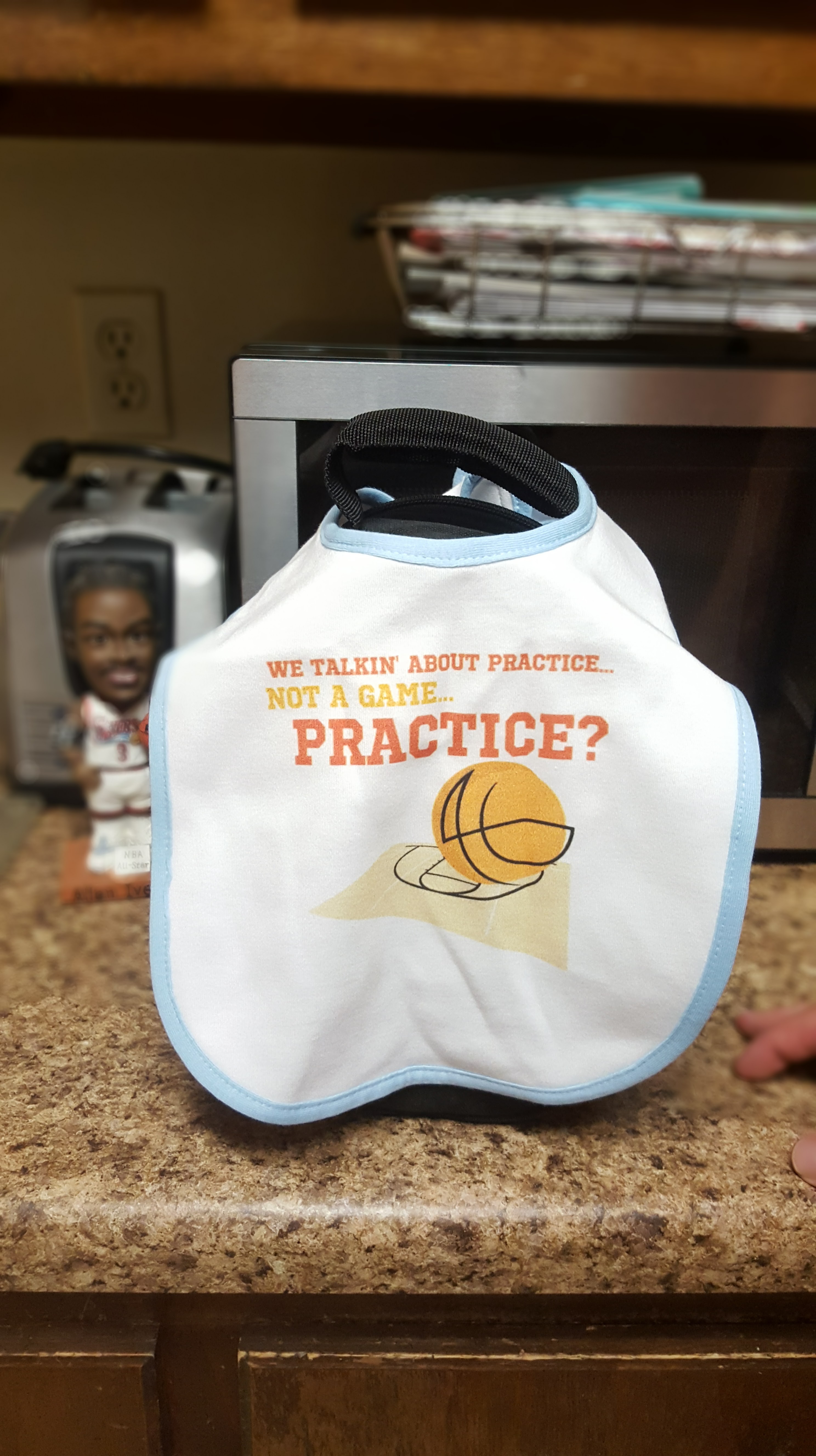 anyone know? Allen Iverson. Yeah, yeah, people are probably thinking that that would not be someone you would want your kid to know about. He’s not a great example or leader, BUT for me, he made me fall in LOVE with basketball! I absolutely loved watching him play, so this made me laugh. I put him next to my A.I. bobblehead and took a snapshot. Thanks Derek! Oh yeah, the tag made me laugh too… for el sessibito (the little sessibo).