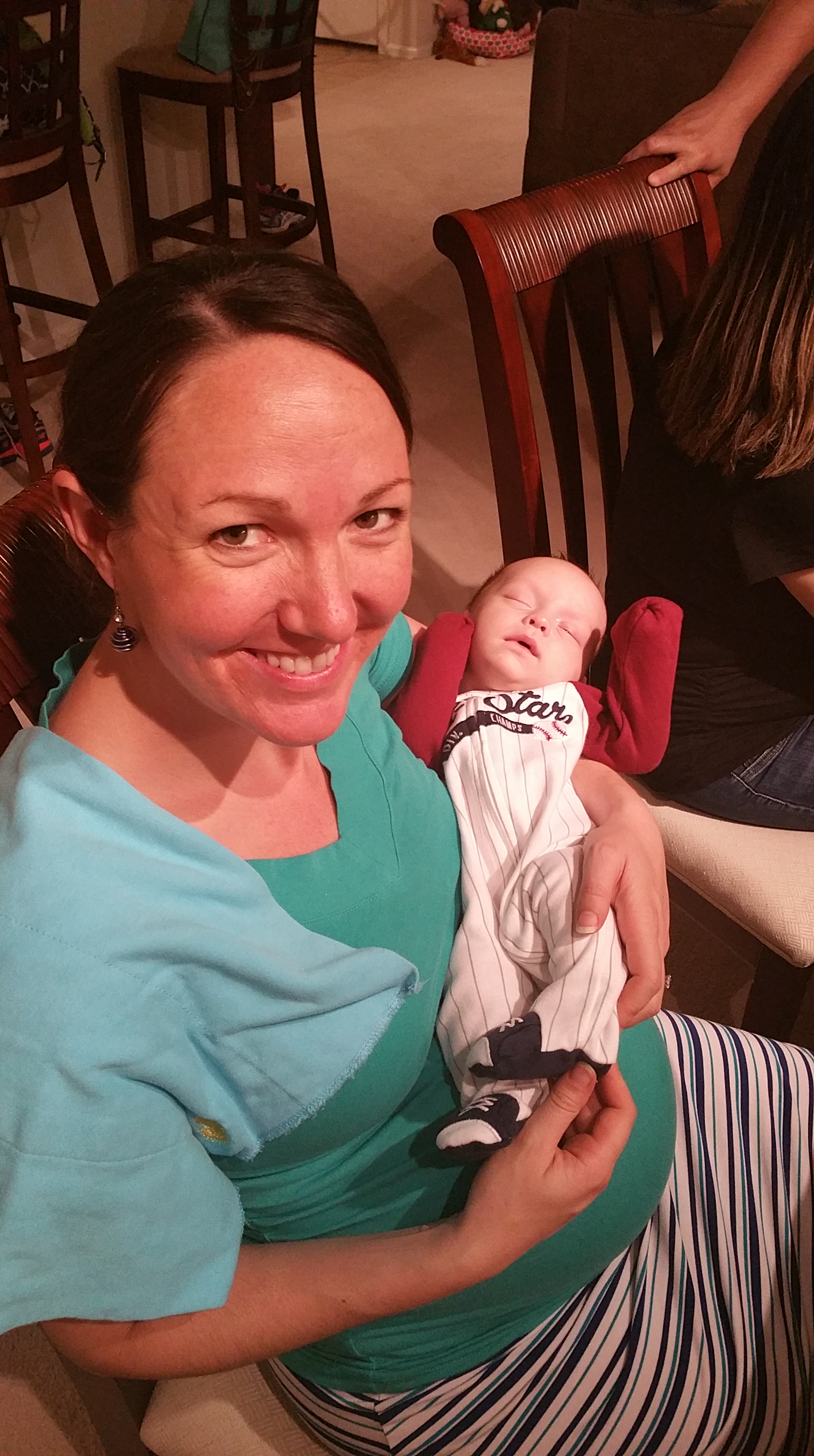 We had the chance to celebrate another friend’s birthday, a bit early, on Saturday. We went over to the Steele’s house for some BBQ and cookies and delicious ice cream cake in honor of Richard’s birthday. We had a great time chatting and catching up with these friends. And I got to finally hold their little one-month old, Declan! It’s kind of strange being this pregnant and holding a little newborn. He sat right on top of my bump, like a little shelf. He is still so tiny- weighing just over 8 pounds. I couldn’t help but to think that this will likely be the size of our son when he is born! It was so much fun to hold him… it was good practice for this mommy-to-be!