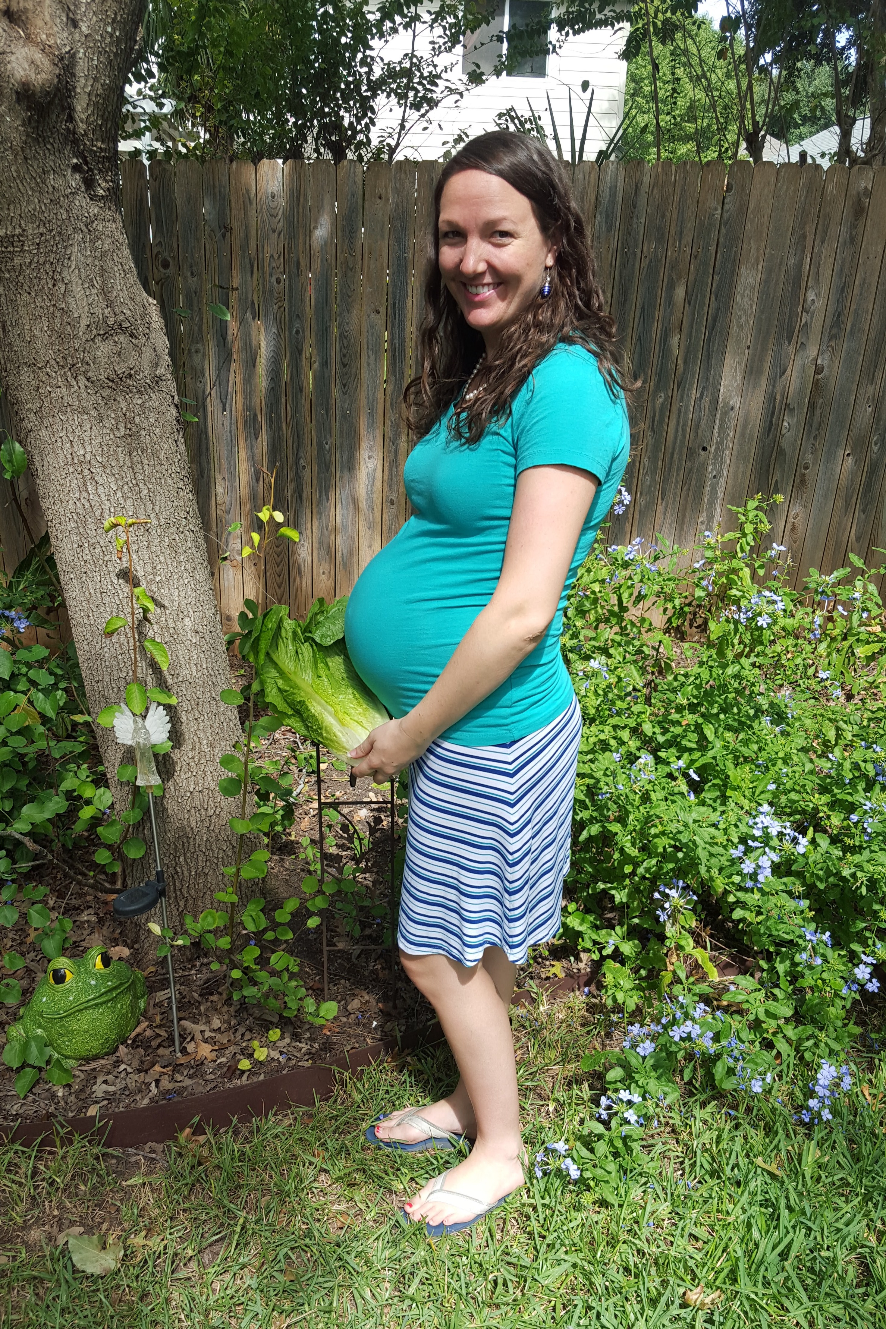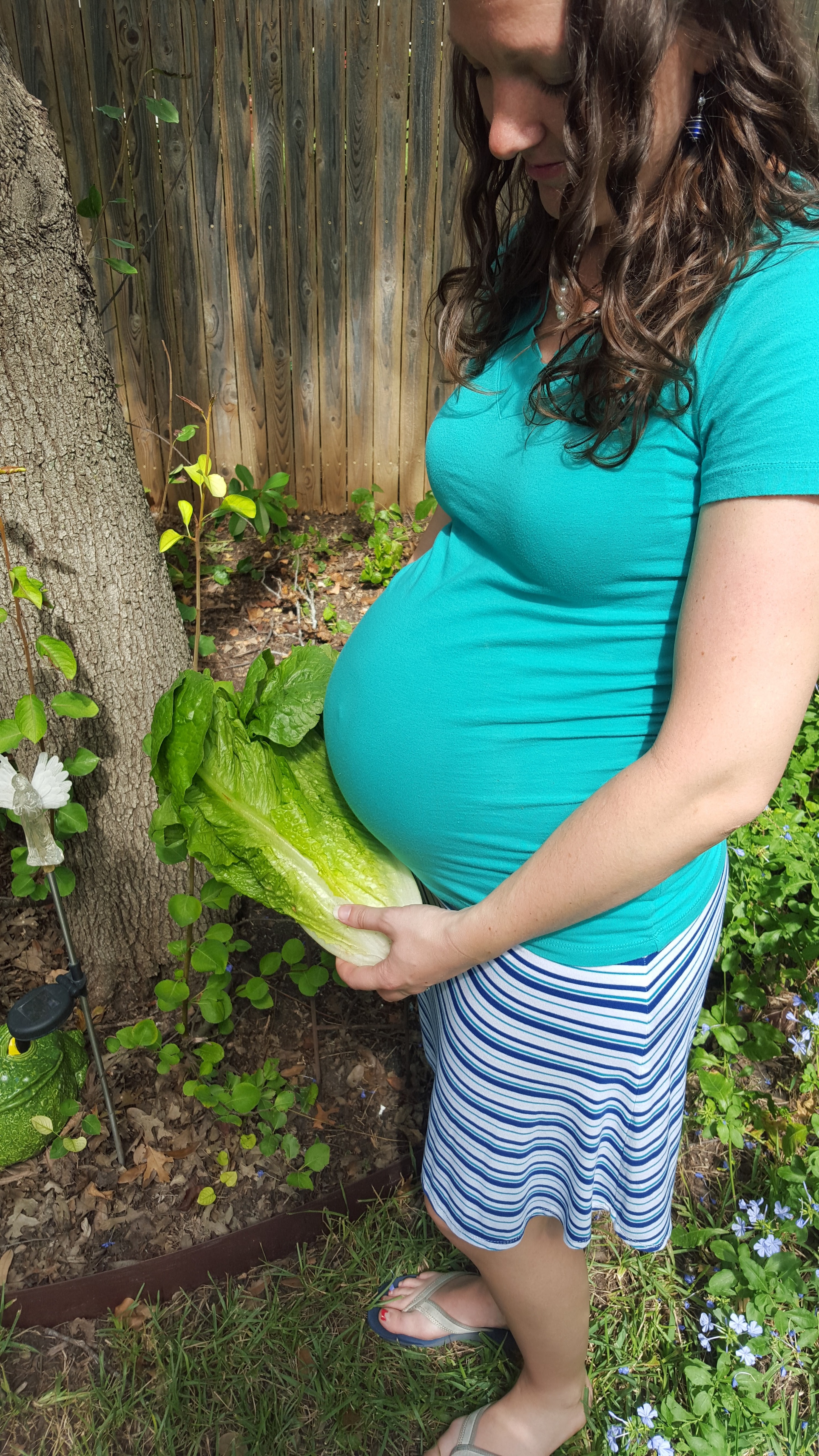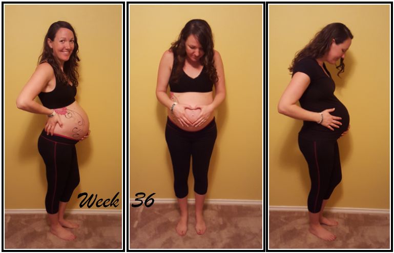 Baby boy is the size of a head of romaine lettuce today (length), measuring about 6 pounds and more than 18 and a half inches long! Space is getting tight in there! He’s losing some of the vernix and the downy hair that covered most of his body during pregnancy (to protect him from pickling in the amniotic fluid). He is now considered “early term” and we only have a few more weeks to go until he’s “full term!” This week we decided to unveil the change in weeks in picture form, using the pineapple that would have represented 33 weeks and the romaine lettuce which more accurately depicts where I am at 36 weeks.