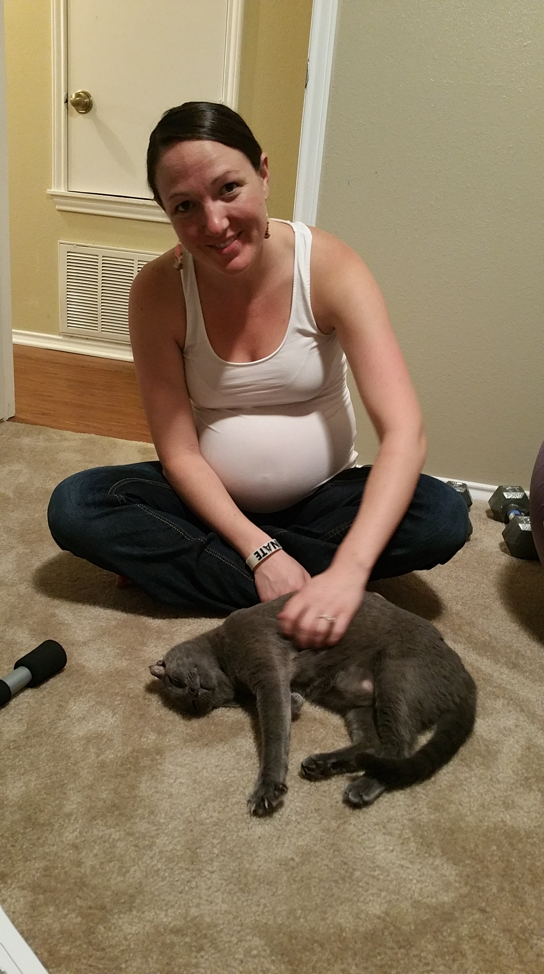 Symptoms this week: well, the dark vertical line that starts to show up late in pregnancy has arrived. It doesn’t go the entire length of my belly, but you can see it on the underside up to my belly button now.
