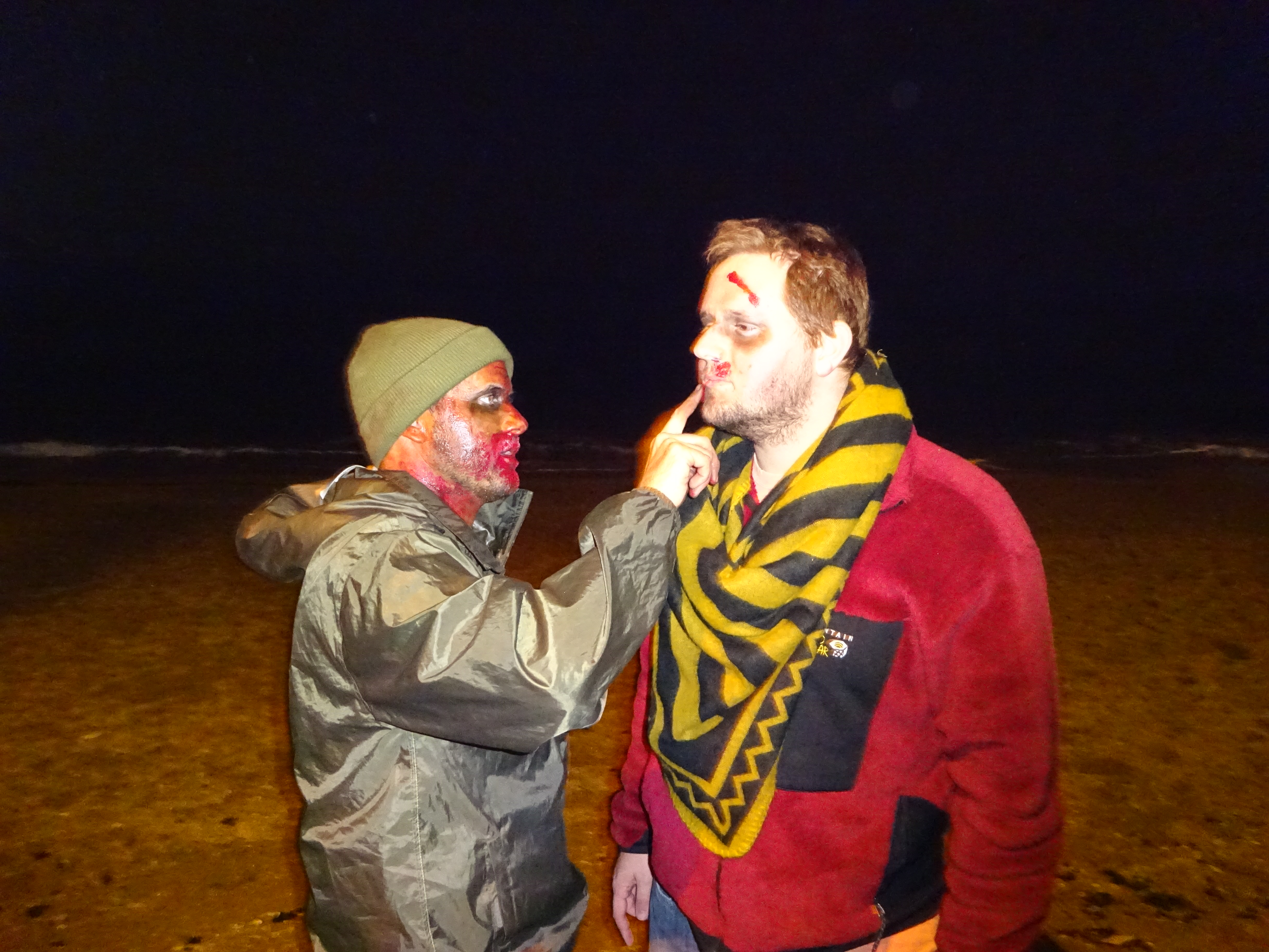 We drove down Xiang Gang Dong Lu, not too far past Polar Ocean World and then stopped near a hotel (I couldn’t tell you what it was called). Matt cautioned us then that we might have to “sneak” past the guards to get to the bonfire location. Geesh, now you tell us! Anyways, there really wasn’t much “sneaking” that we had to do. We just went down by the beach and then had to pass through the hotel’s backyard to get to the cliff area by the beach where the bonfire was being held. As we were walking, our other friend Andrew joined us. He was also in need of make-up, so Trent got yet another chance to practice his zombie-making magic.