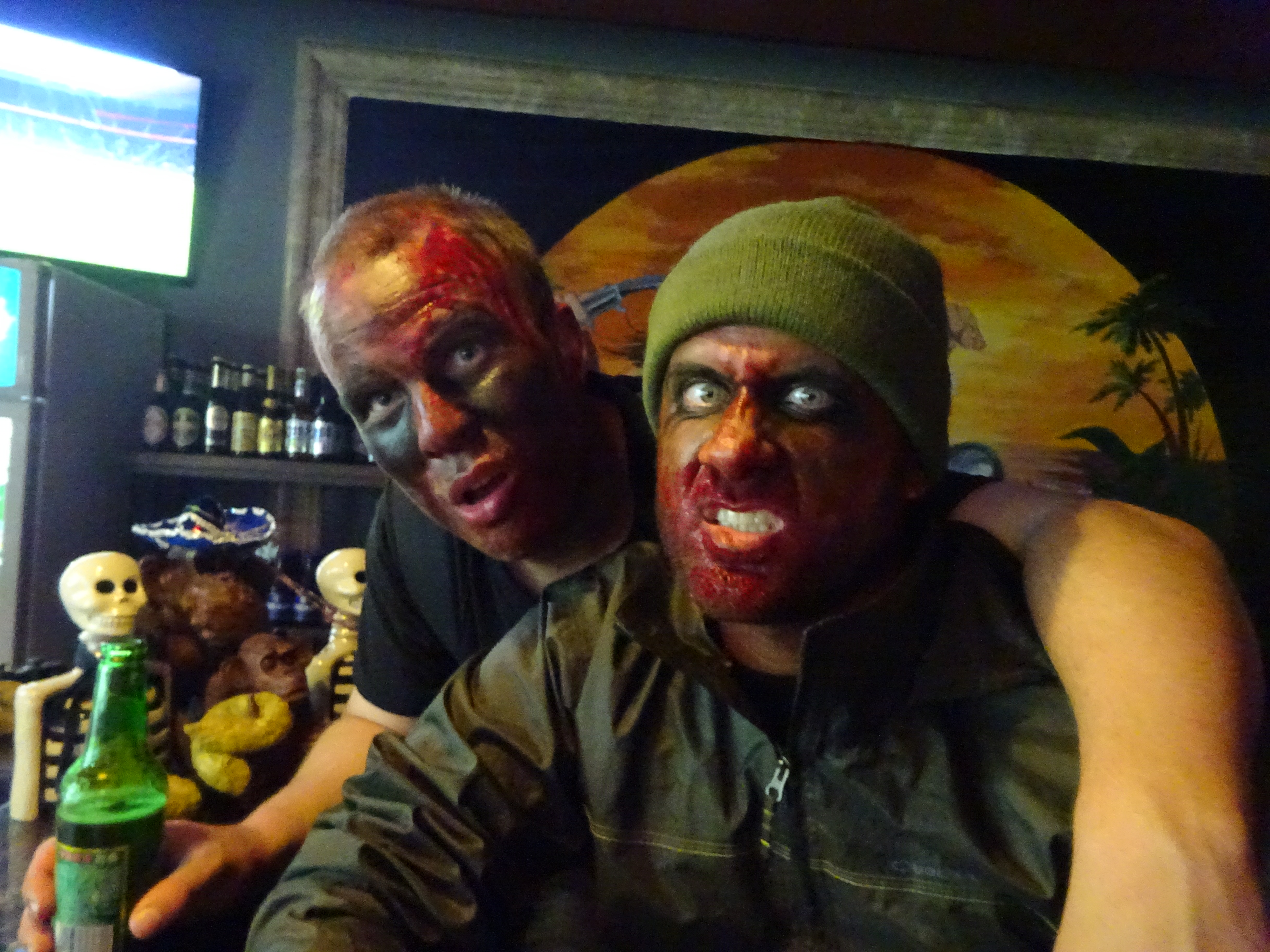 Matt didn’t live far from us, so we hopped on our scooter and headed over to his place to meet him and get him made up before heading out. While we were on our way, we snapped the BEST. PICTURE. EVER. We look uber creepy!