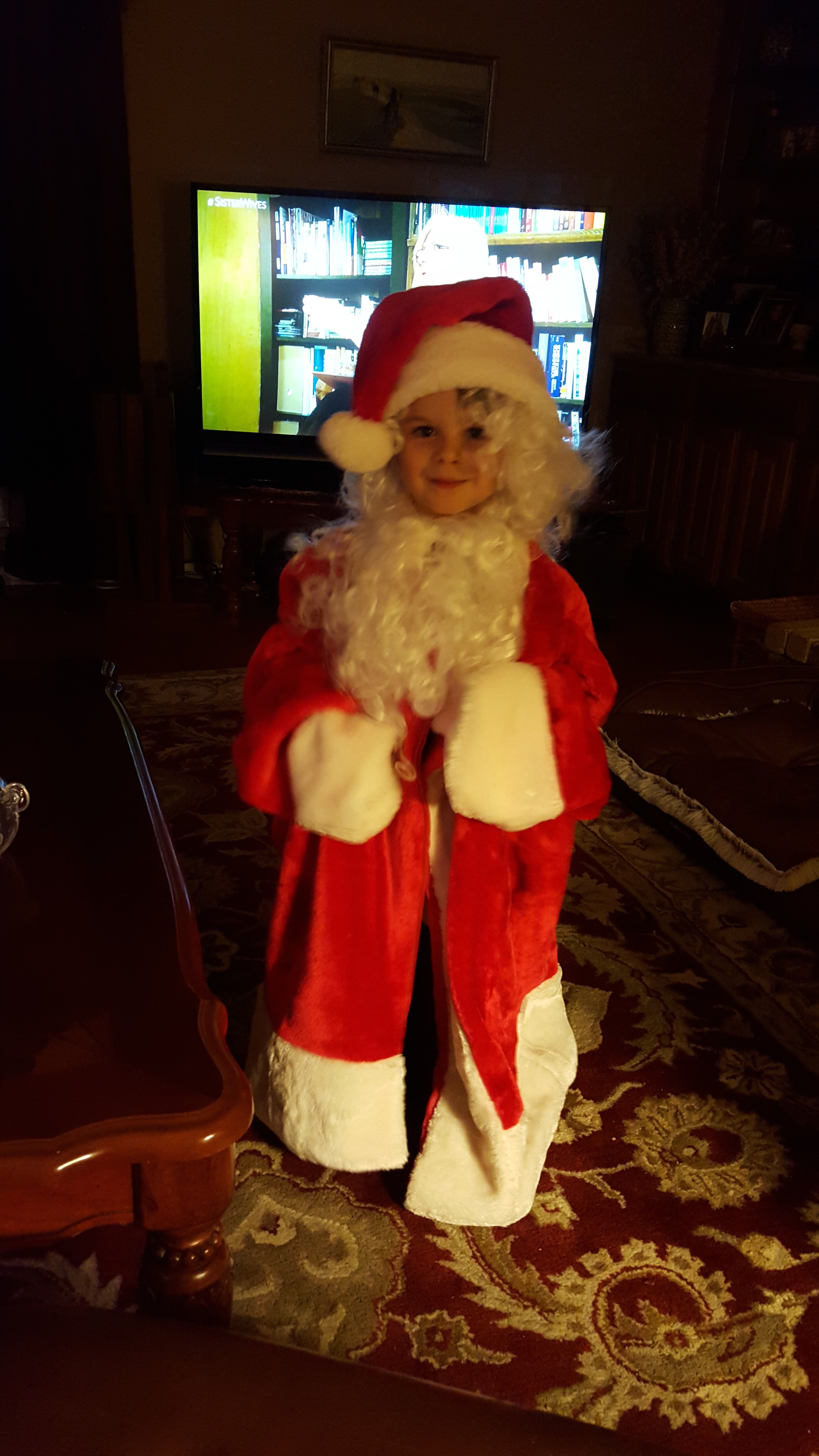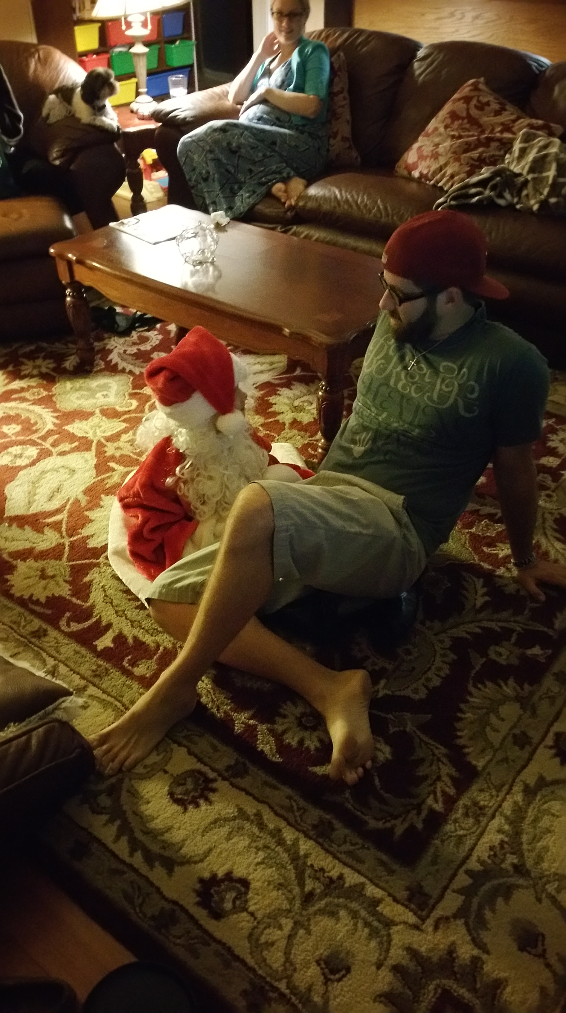 Last Sunday night we went over to Trent’s parents’ house to watch the Walking Dead… OMG… seriously!?! After that super intense episode, I can’t believe I didn’t go into labor! Trent’s sister and brother-in-law were there with our nephew Cohen. He was playing dress-up with the Santa suit. He made a very adorable Santa! He even let uncle Trent sit on his lap.
