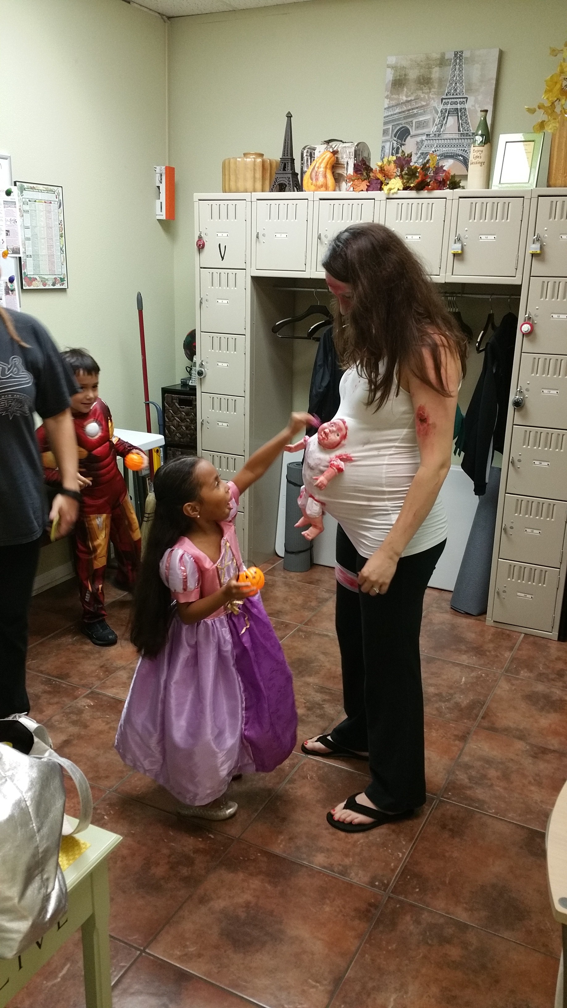 Friday evening we had our first Halloween party- it was at DeVoir Fitness, just down the road from our house (on FM 78 near 3009). It was a costume party. Trent and I dressed up like zombies, and made a zombie baby look like it was breaking out of my belly, then we headed out. Everyone there was pretty much working out, but because of all the make-up we were wearing, we decided just to hang out. Some families had brought their kids and their reactions to my costume were awesome! They were very cute, but they let me know that they thought it was pretty creepy! And it was… Anyways, by the end of the night they weren’t so much creeped out by it anymore, they just thought it was funny. Trent and I did win the costume contest and I got a few free classes. (YAY!)