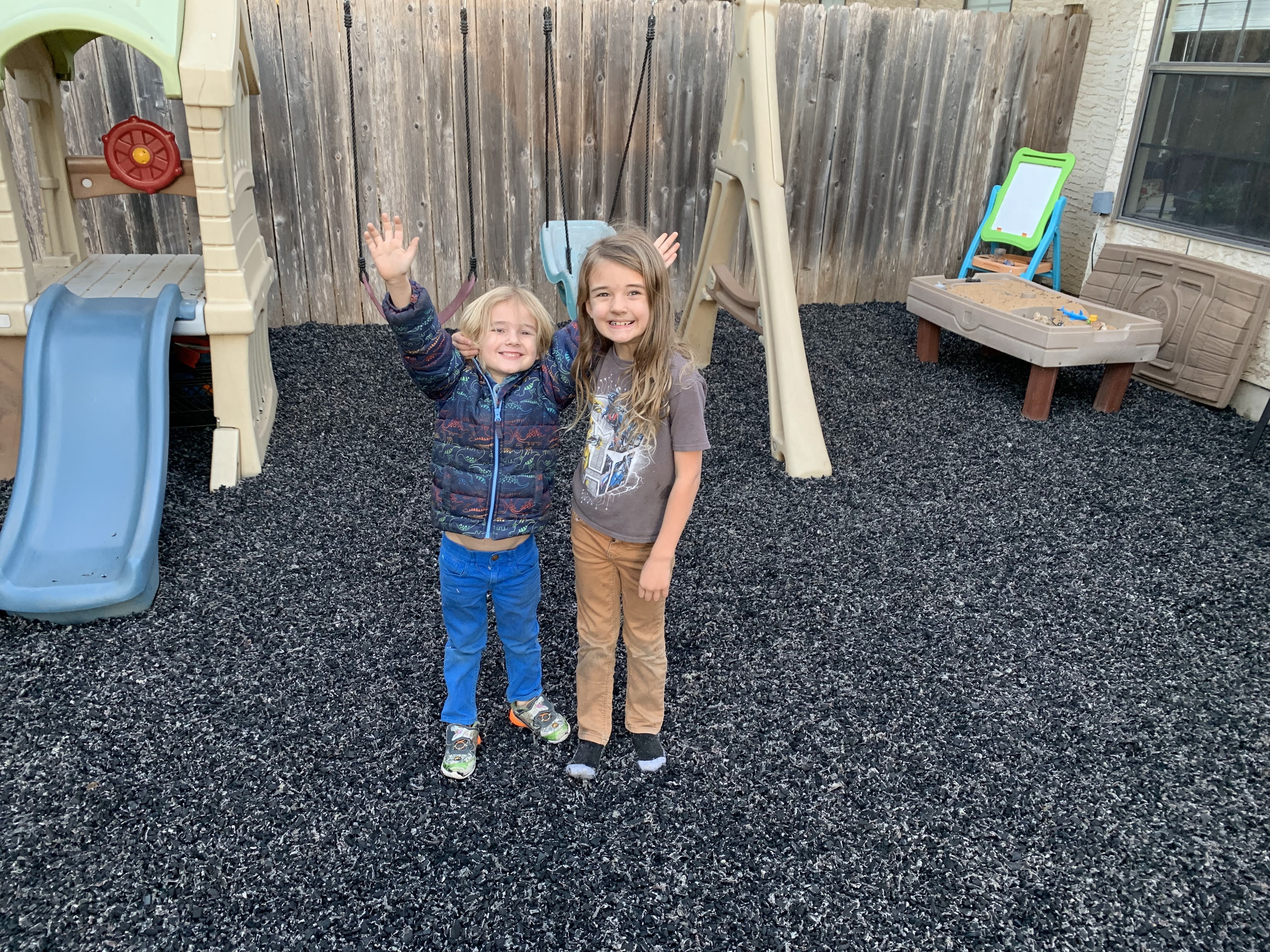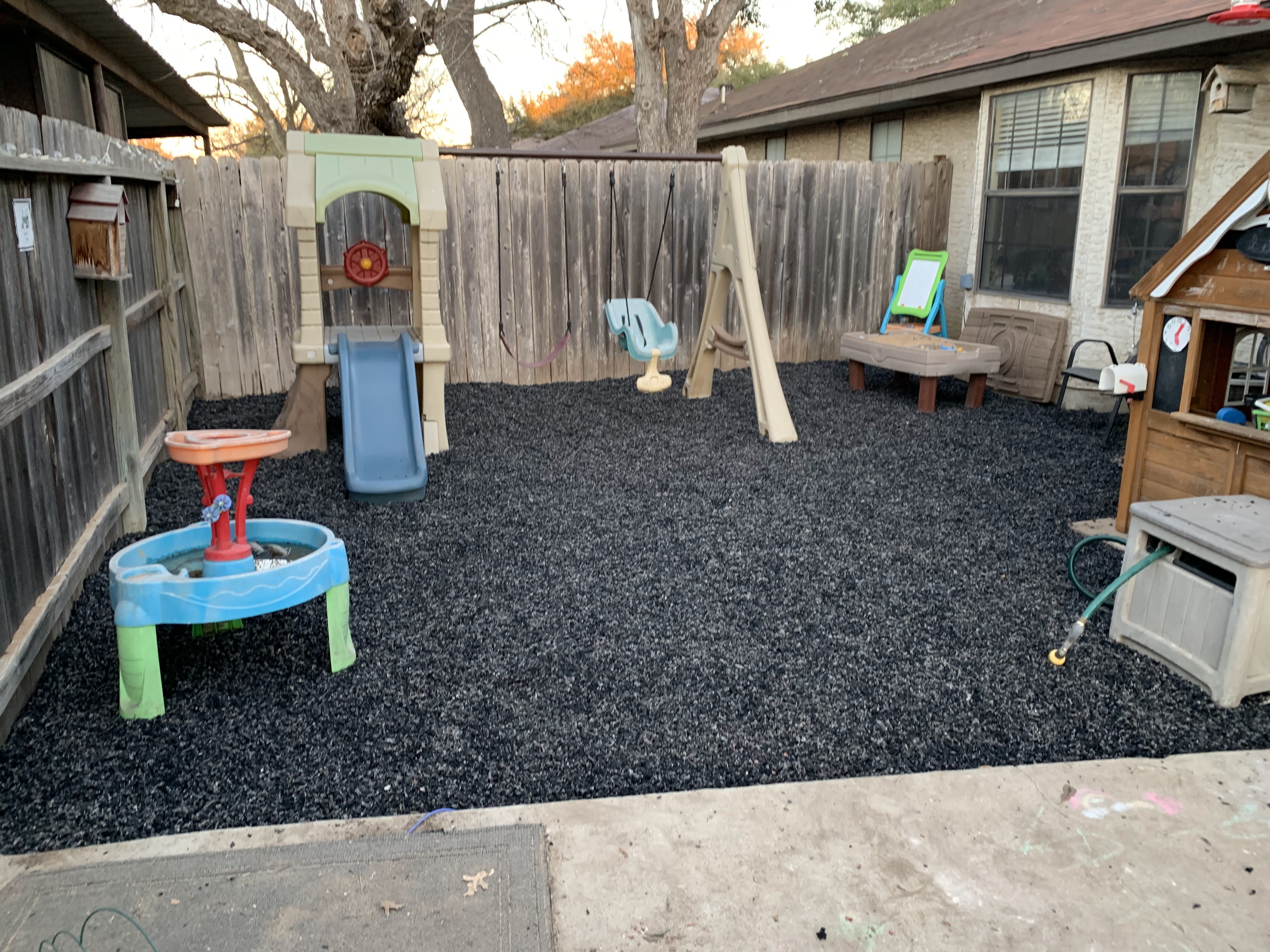 We took on various small-scale home improvement projects this year. In the early part of the year our in-laws gifted us with rubber mulch for the “kids” half of our backyard. They came over and we all laid it down. It looks great and has made for far less mud being tracked into the house!