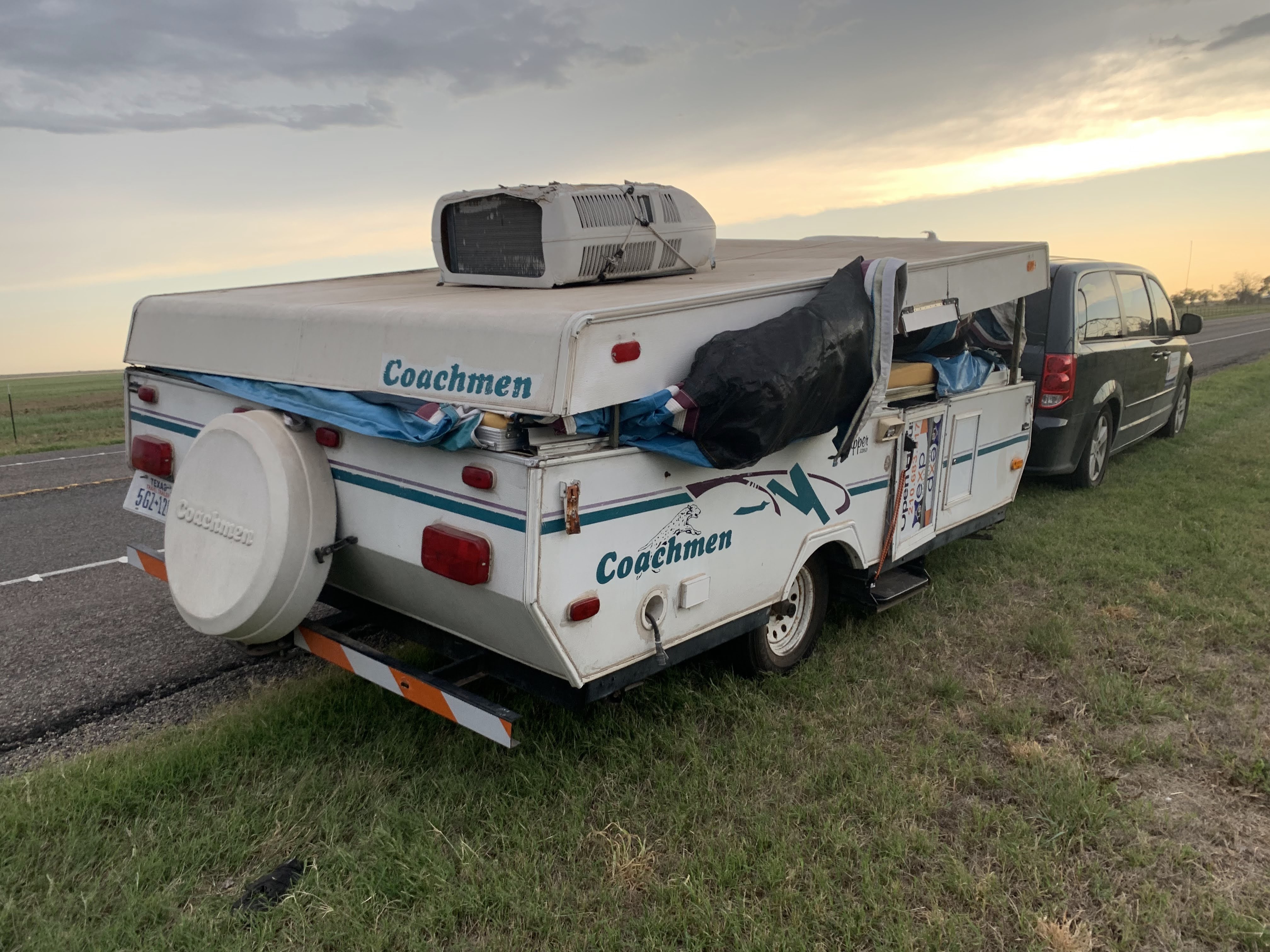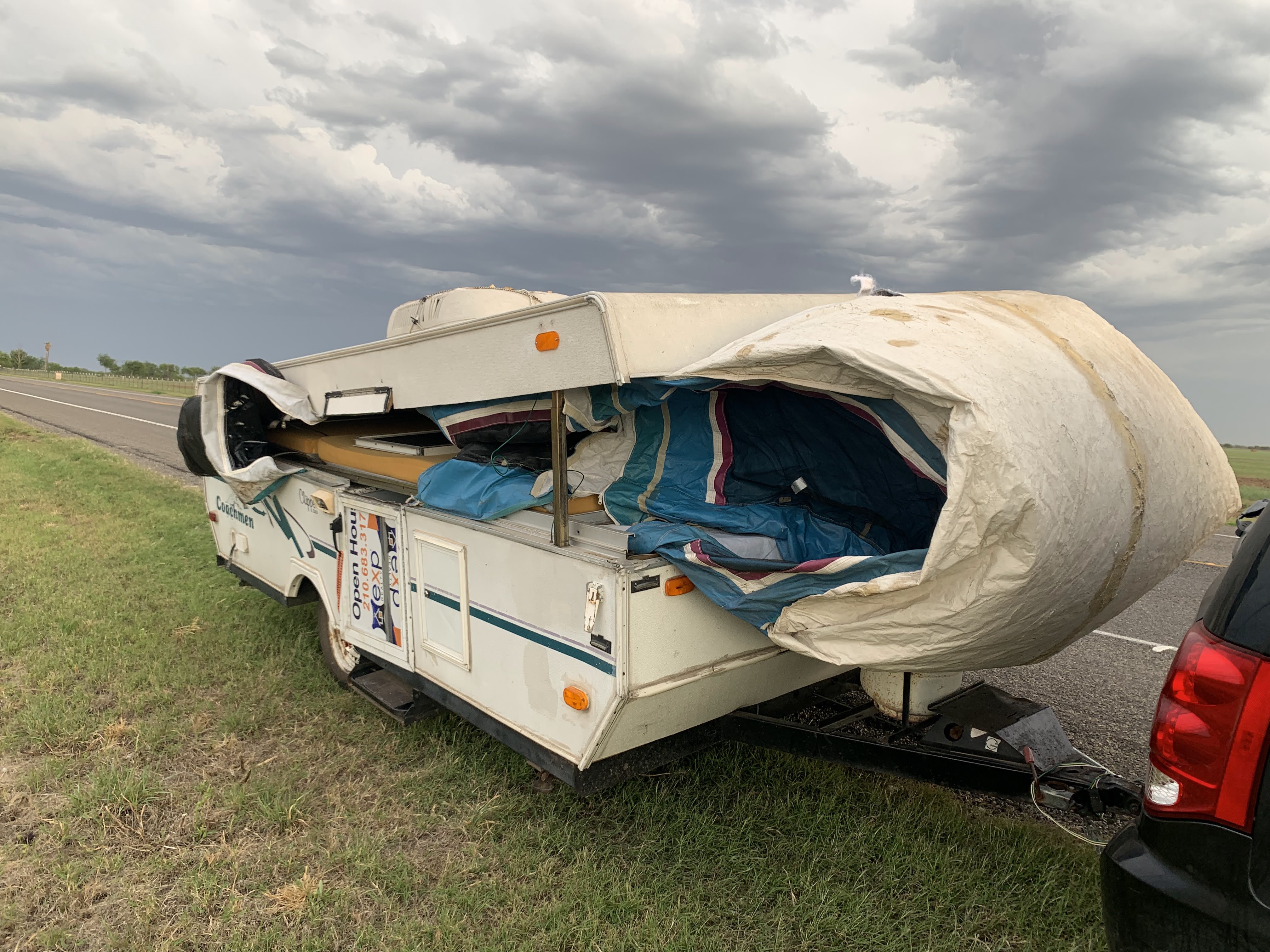 We ended April on a bit of a low note. We were headed to camp in Concan to celebrate our friend Ross’s birthday. It was a very windy day when we were driving and there were a lot of severe storms to the south of us. All of a sudden I began to feel a lot of drag on the car so I pulled off to the side of the road. As I looked in the rearview mirror, I saw that our pop-up camper had ripped open and was basically a huge parachute behind us. Basically the wind had gotten underneath it, ripped the clasps right off of the camper and jammed the front end up, while the back end was stuck down. We had two sweet, sweet teenage boys stop to help us and they were a total Godsend. They ended up ratcheting the camper down so we could at least finish our drive. When we got to Concan, the people working there were also super kind. They offered us a cabin for the night at half price and we ended up having a wonderful weekend! Unfortunately, the camper ended up being a total loss. The insurance wouldn’t cover it and it’s going to cost too much for us to fix, so we’re still not sure exactly what we’re going to do with it. Right now it’s just a big paperweight…