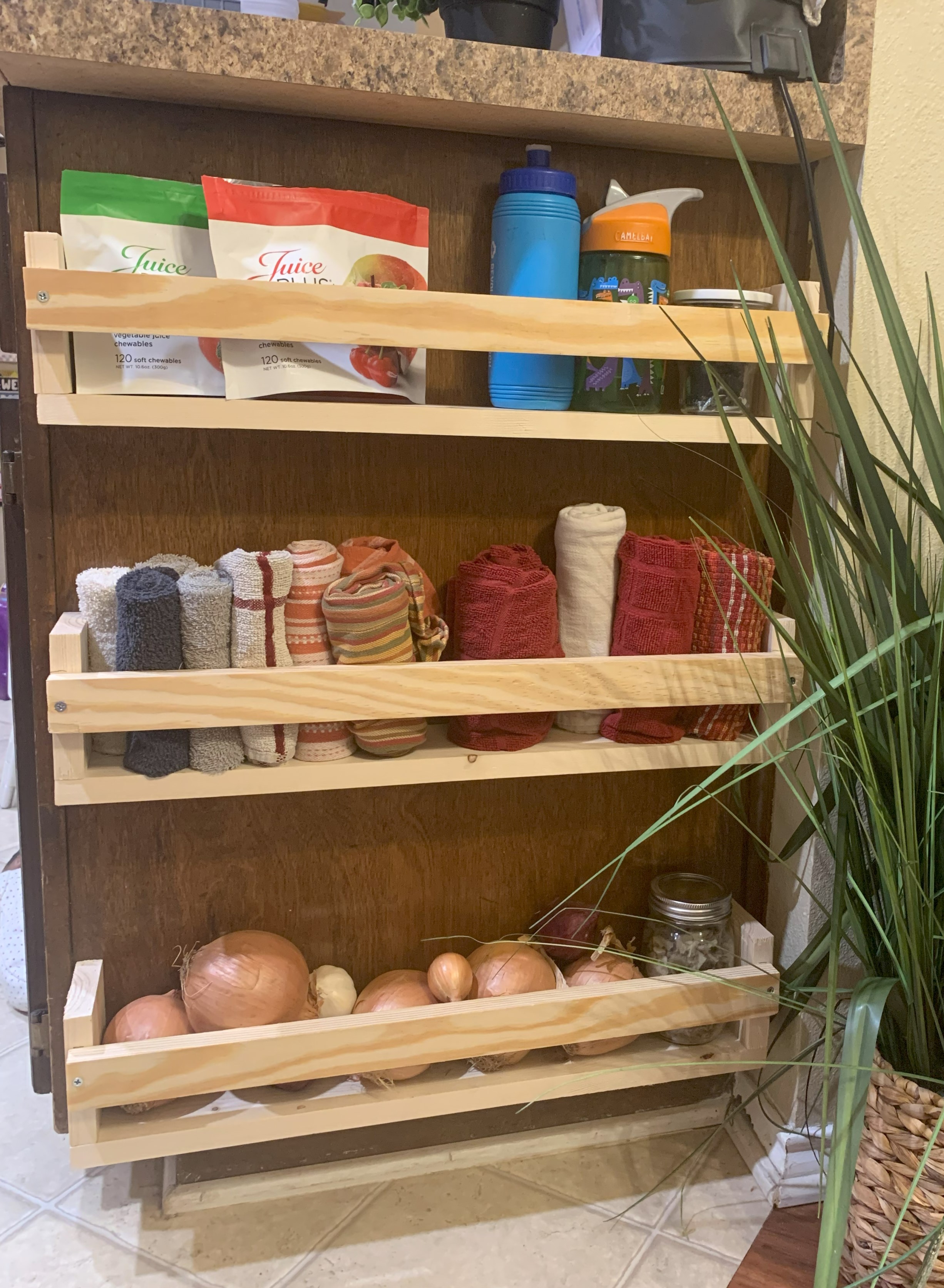 We got a new roof put on both the house and the man cave, and added some small skinny shelves on the side of our cabinet.